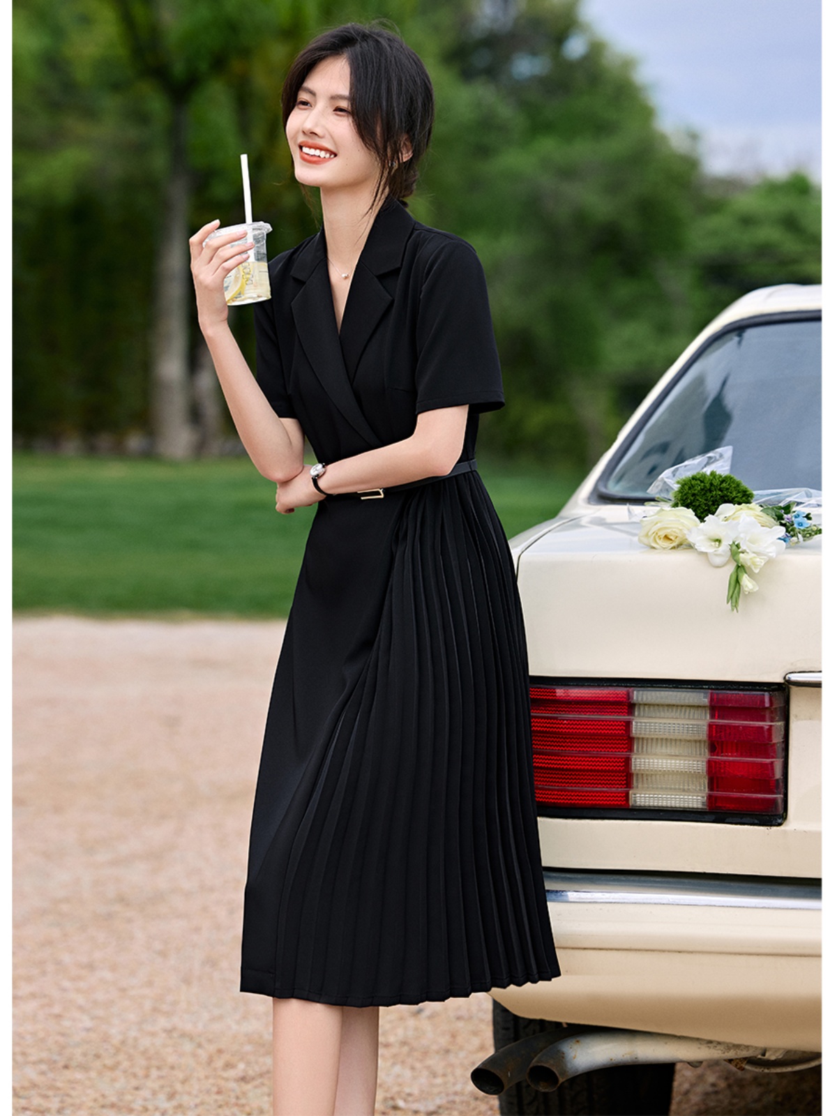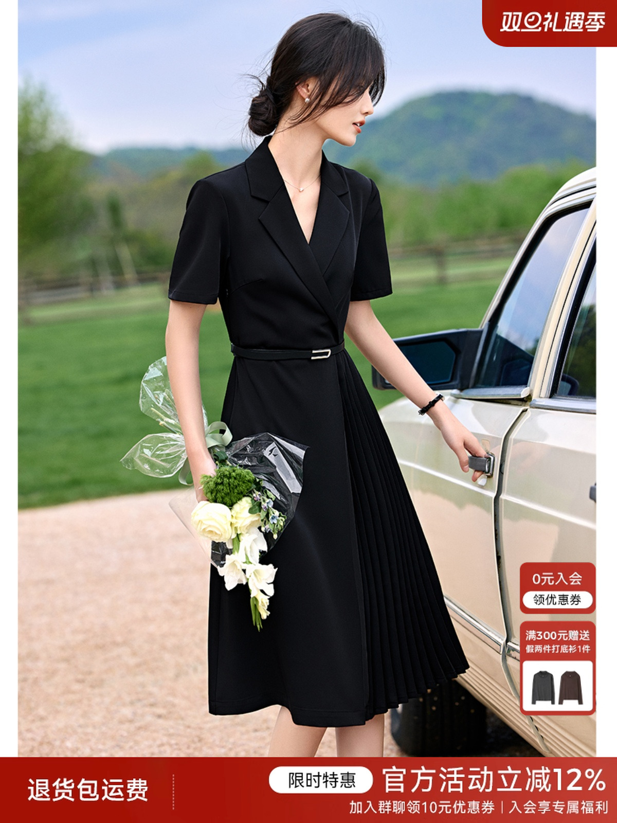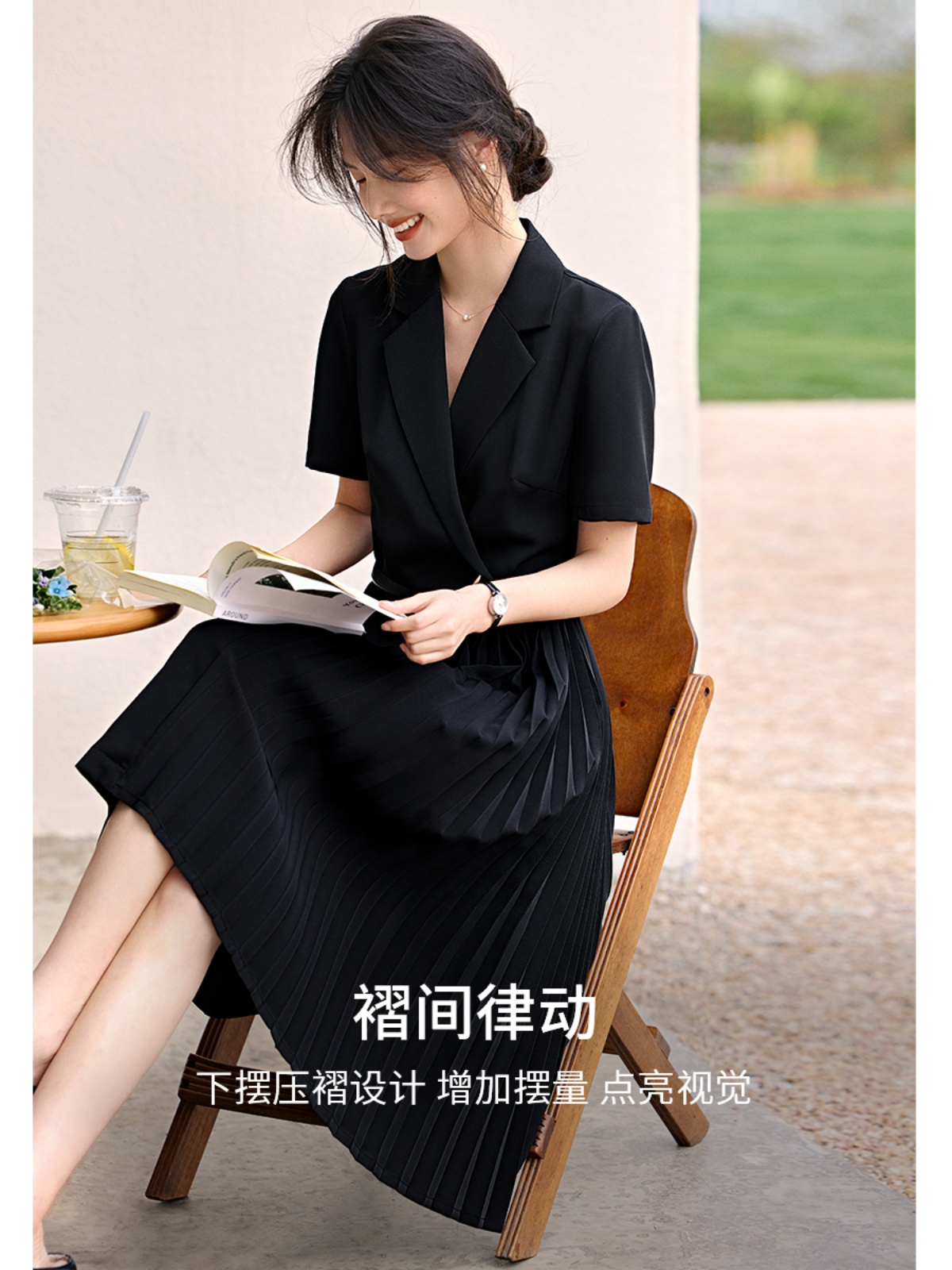 XWI欣未早秋通勤西装连衣裙女夏季收腰显瘦压褶设计轻职场小黑裙